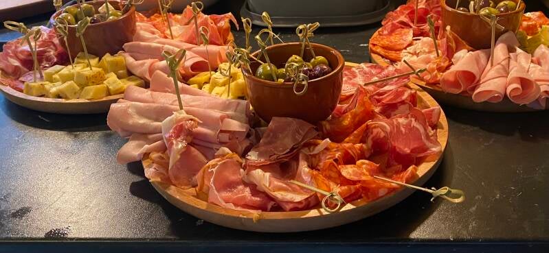 Mortadella, verschillende soorten ham en salami's, kaasjes en olijven.