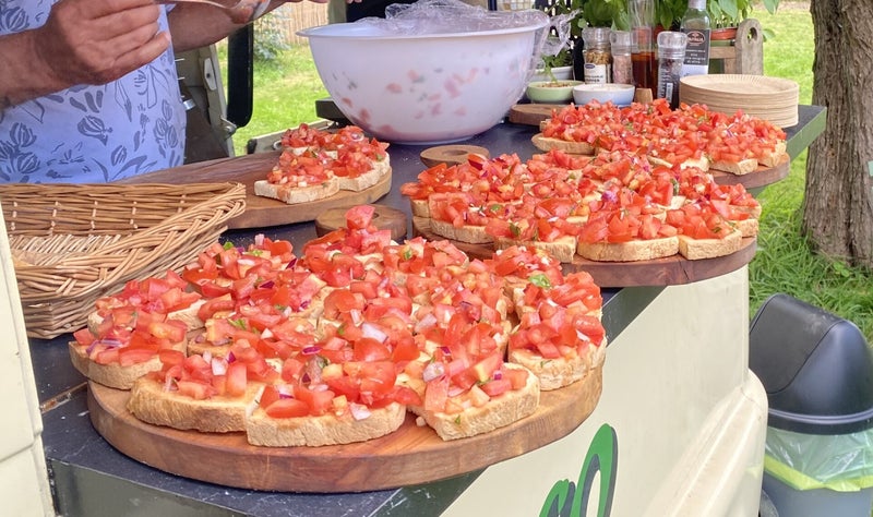 vers geroosterde bruchetta's met daarop een mix van tomaat, verse basilicum, knoflook en extravirgine olijf olie.