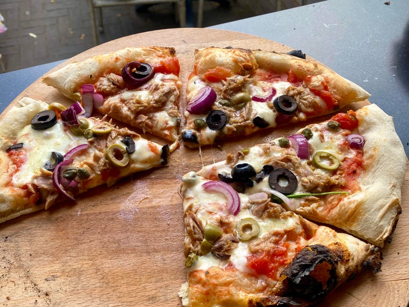 de pizza Napolitana met pittige Ansjovis, kappertjes en zwarte olijven.